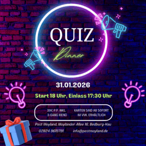 Unser beliebtes Quizdinner geht in die nächste Runde. Am 31.01.2026 darf wieder fleißig geraten werden. 3 Runden Fragen aller Art, 3 Gänge leckeres Essen in schöner Atmosphäre. Einlass ist um 17:30 Uhr, Start um 18:00 Uhr. Tickets inkl. Essen können ab sofort für 39€ in der Post Moyland gekauft werden. Gerne können Sie die Tickets auch per Email reservieren: info@postmoyland.de